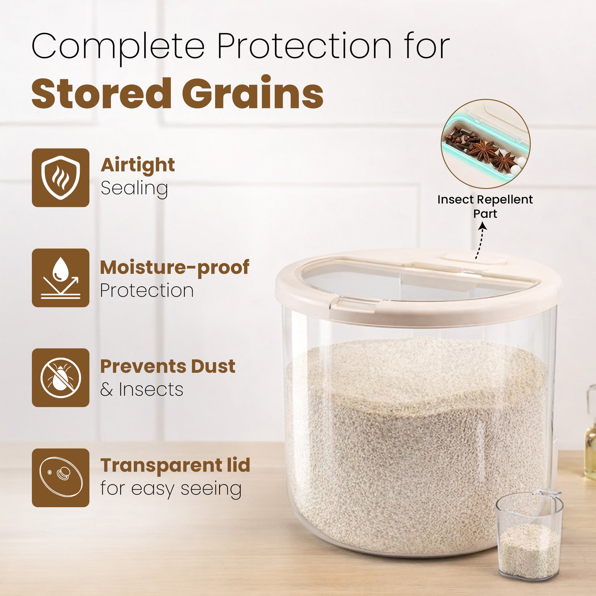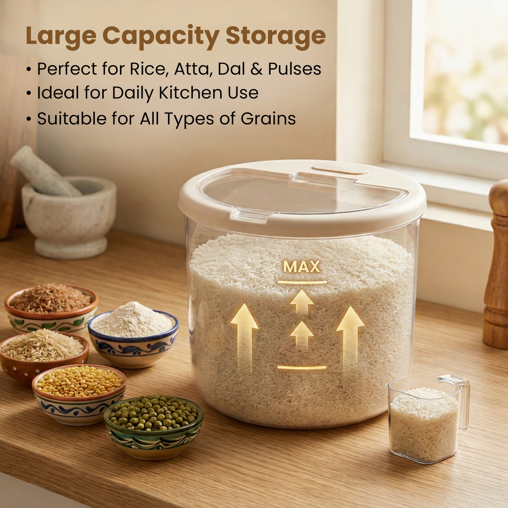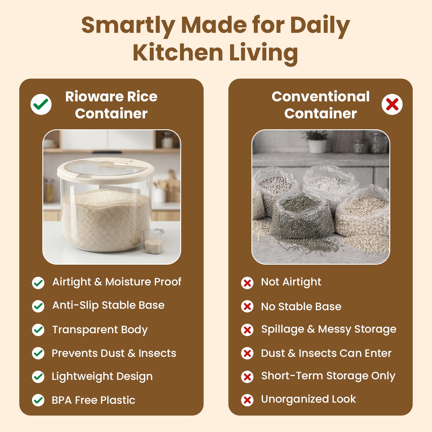 Rioware 10kg Transparent Rice Storage Container with Date Tracker, Airtight Grain Storage Box, BPA-Free Food Container for Rice, Flour & Pulses